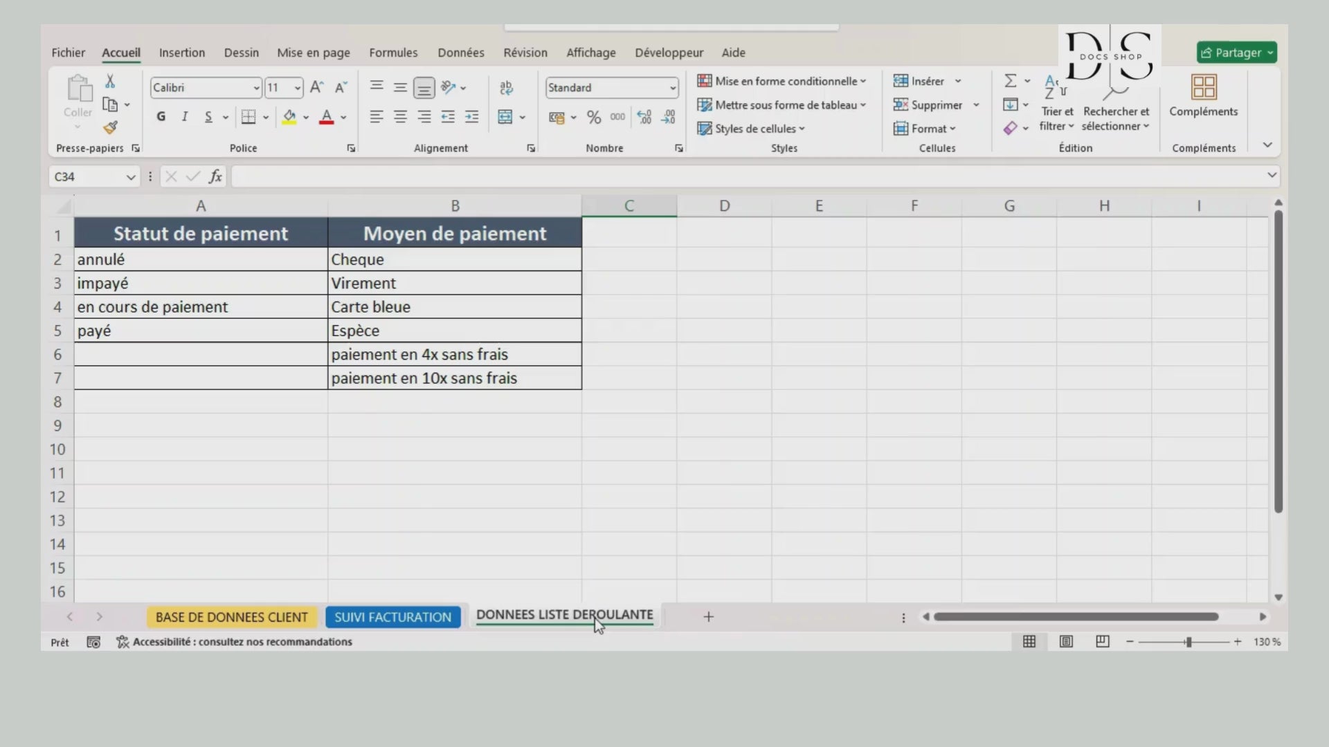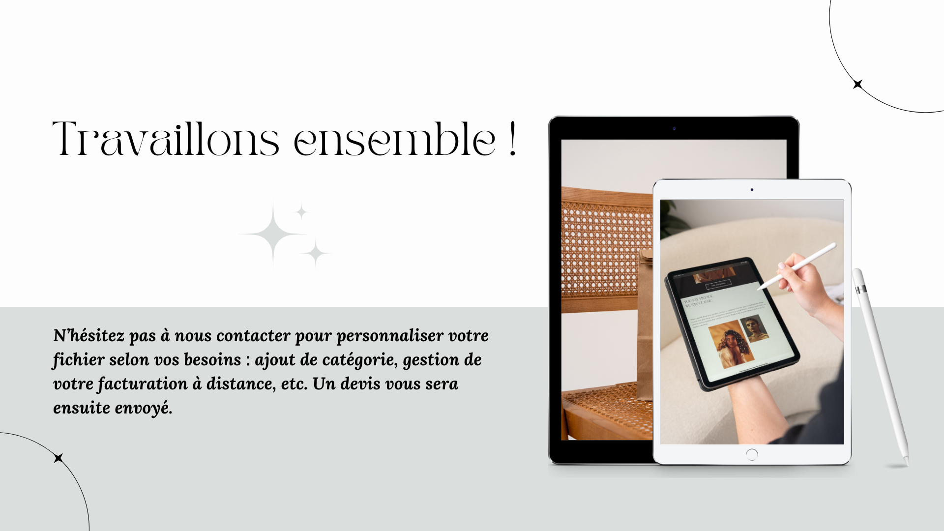 N’hésitez pas à nous contacter par mail (docsshop27@gmail.com) pour personnaliser votre fichier selon vos besoins : ajout de catégorie, personnalisation de la liste déroulante, gestion de vos factures à distance, etc. Un devis vous sera ensuite envoyé.